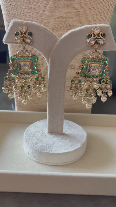 These elegant Emerald pearl earrings are perfect for weddings and special occasions. The pearls add a touch of luxury, while the gold plating adds a timeless charm. Made with beautiful emerald pearls, these earrings are sure to complement any outfit and make a statement.
