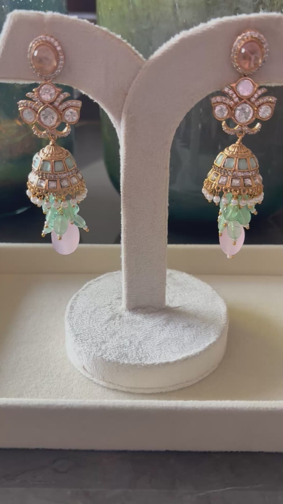 Pink & Mint Green Polki Jhumkas combine traditional craftsmanship with contemporary elegance. These statement earrings feature lustrous polki stones in soft pink and refreshing mint green hues, creating a sophisticated color palette perfect for both festive occasions and weddings.