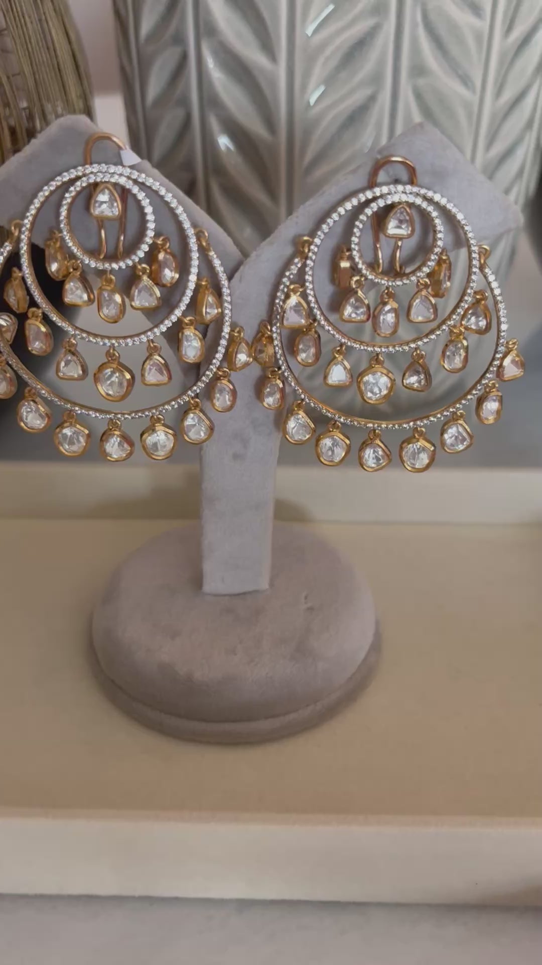 Crafted with precision, these Layered Polki Chaandbalis showcase semi-precious stones set in rich gold plating. Their layered design enhances visual depth, offering a sophisticated look suitable for weddings and festive events. Combining traditional craftsmanship with modern aesthetics, these earrings provide lasting shine and elegance while complementing intricate ethnic attire flawlessly.