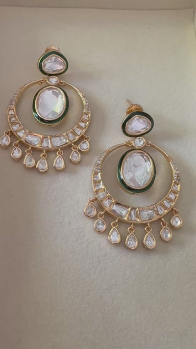 Adorn yourself with these magnificent Polki Statement Chaandbalis, the ultimate accessory for weddings and festive occasions. These chandelier earrings feature lustrous polki stones set in gold-plated metal, combining traditional Indian jewelry craftsmanship with luxurious appeal.
