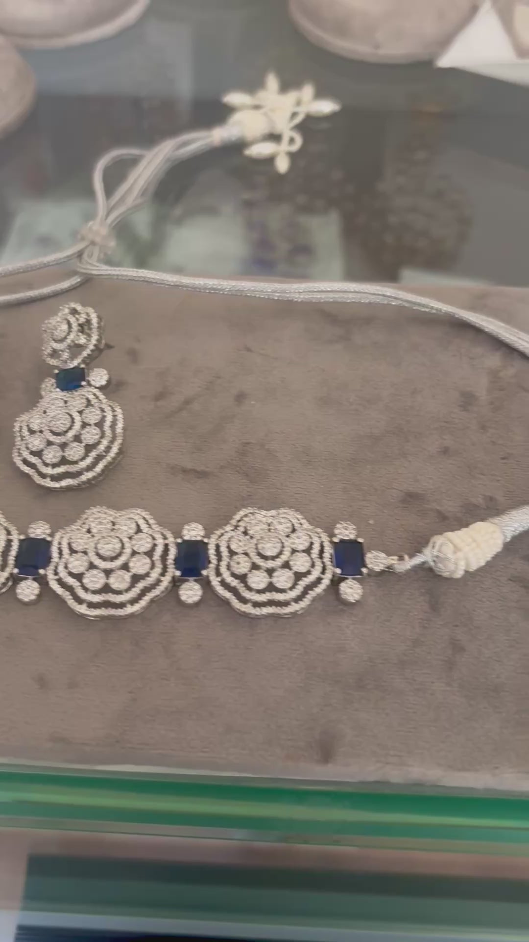 This Sapphire & Diamond choker set features a beautiful combination of semi precious blue sapphires, diamonds, and silver plating. The result is a luxurious piece of jewelry that adds elegance and sophistication to any outfit. Stand out from the crowd with this stunning choker set.