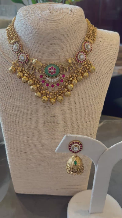 Suvarna Antique Gold Neckpiece with Jhumkas