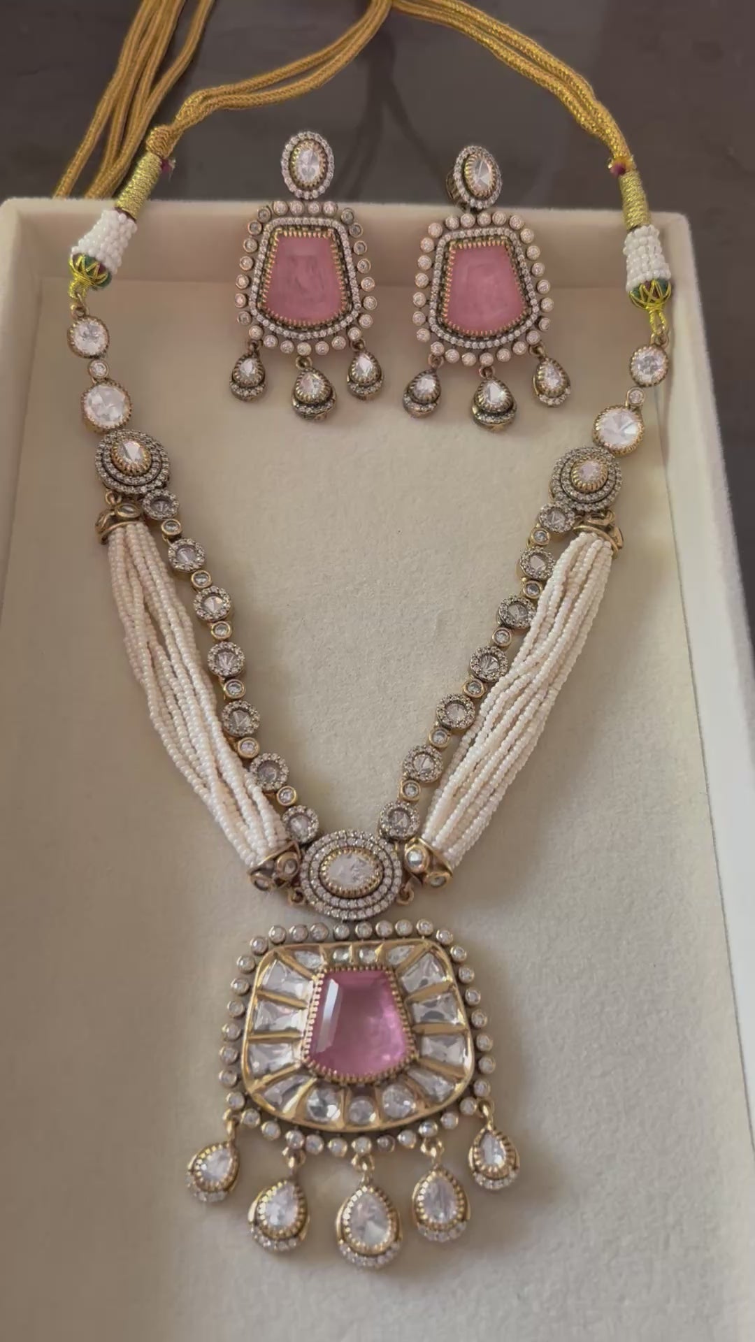 Handcrafted with delicate pearl beads, this Victorian style festive set is a timeless addition to any jewelry collection. The pink semi-precious stones add a touch of elegance and sophistication to any outfit, making it perfect for formal occasions. Don't miss out on this stunning neckpiece and earrings set.