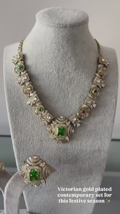 This Victorian multi stone semi precious set features a beautifully crafted dull gold plated design, perfect for any festive occasion. With its array of semi precious stones, this set exudes elegance and adds a touch of sophistication to any outfit. Elevate your style with this stunning and timeless piece.