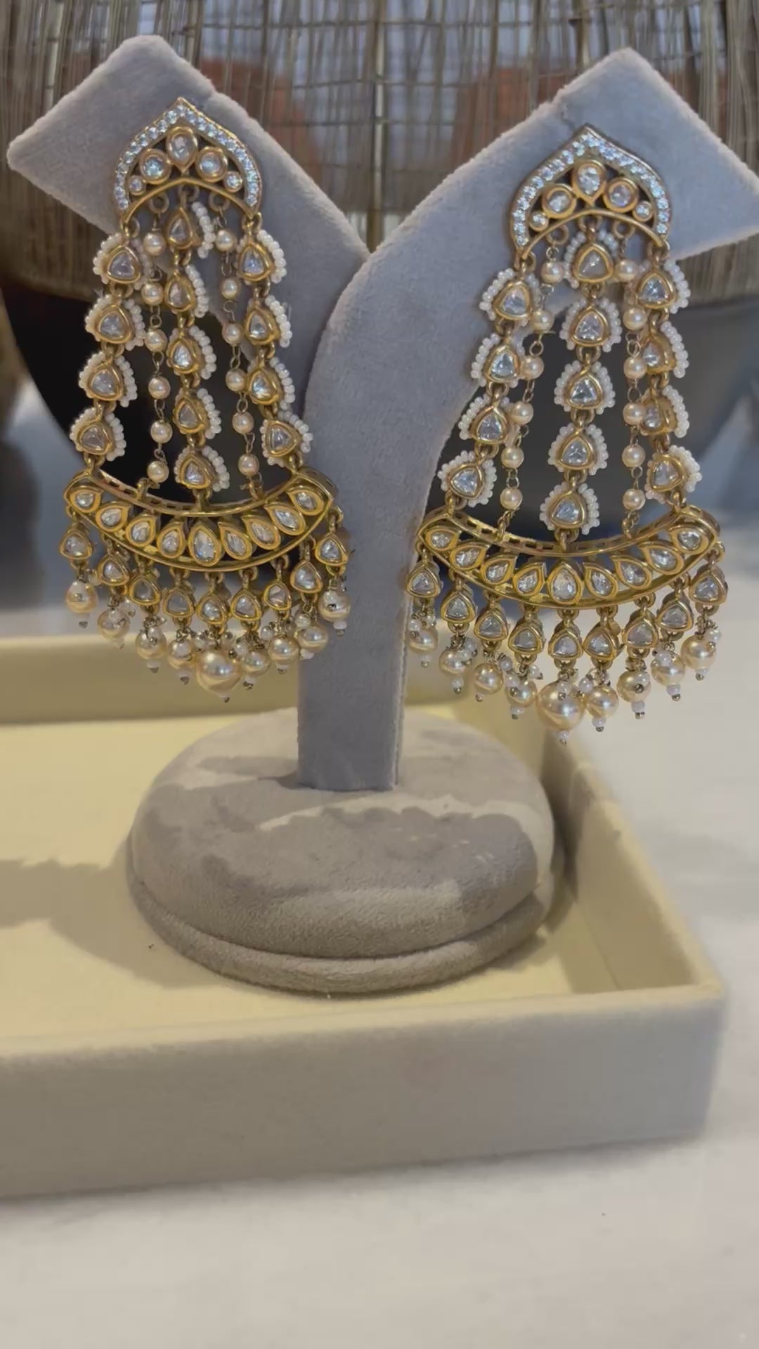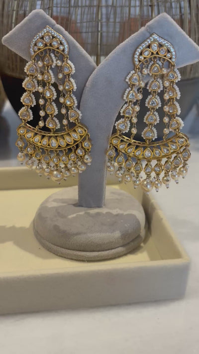 The Waterfall Polki & Pearl Chaandbalis showcase meticulous craftsmanship, featuring semi precious Polki stones arranged in a cascading design complemented by delicate pearls. This blend of traditional craftsmanship and refined aesthetics offers a timeless accessory that enhances formal and festive attire. Lightweight construction ensures comfortable wear, while the intricate detailing adds a subtle yet striking elegance, making these chaandbalis an essential piece for connoisseurs of fine jewellery.